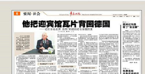 另一个让魏特曼牵肠挂肚的事儿,就是最近青岛刚刚启动的迎宾馆修复工程。魏特曼的翻译王鹏刚博士告诉记者,这次青岛迎宾馆“修旧如旧”的方案,魏特曼在其中给出了不少建议。“迎宾馆这次更换的瓦片和瓷砖,最早就是由魏特曼教授背回德国,找到当年的原厂,并把重新生产出的样品带回了青岛。”也正是有了魏特曼这个“使者”,青岛方面联系上了德国的厂家,并购入了和100多年前一样的建筑材料。