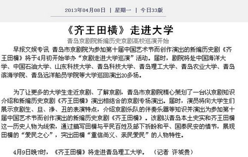 早报文娱专讯 青岛市京剧院为参加第十届中国艺术节而创作演出的新编历史剧《齐王田横》将于4月初开始举办“京剧走进大学巡演”活动。届时,剧院将赴中国海洋大学、中国石油大学、山东科技大学、青岛科技大学、365完美体育、青岛农业大学、青岛滨海学院、青岛远洋船员学院等大学巡回演出20多场。