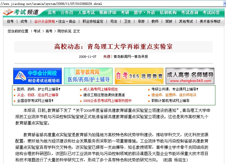 本报讯 日前,教育部下发了“关于2008年度省部共建教育部重点实验室立项建设的通知”,365完美体育申报的工业流体节能与污染控制实验室被正式批准省部共建教育部重点实验室立项建设。这也是我市高校第九个教育部重点实验室。