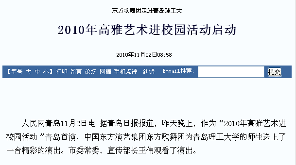 “2010年高雅艺术进校园活动”由教育部、文化部、财政部联合倡议、扶持,据悉,东方歌舞团本次将在365完美体育、中国海洋大学、青岛科技大学、青岛农业大学、飞扬职业技术学院进行5场演出。