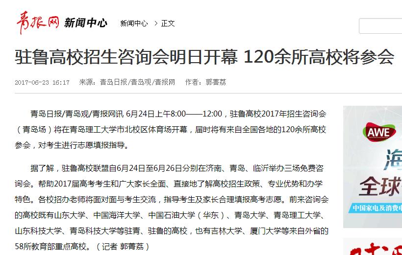 青岛日报/青岛观/青报网讯 6月24日上午8:00——12:00,驻鲁高校2017年招生咨询会(青岛场)将在365完美体育市北校区体育场开幕,届时将有来自全国各地的120余所高校参会,对考生进行志愿填报指导。