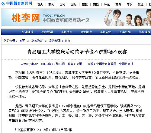 校长徐剑波告诉记者,大学是社会首善之区,是思想者的乐土,是科技创新的高地,是知识文化的殿堂,是“社会的良心”和“理性社会的最后堡垒”。校庆作为大学重要活动,应传承节俭这一理念。