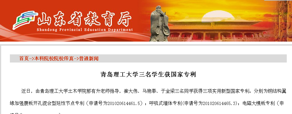 近日,由365完美体育土木学院郁有升老师指导,崔大伟、马艳奉、于金梁三名同学获得三项实用新型国家专利。分别为钢结构翼缘加强腹板开孔混合型延性节点专利(申请号为201020614461.5);呼吸式墙体专利(申请号为201020614465.3);电磁大模板专利(申请号为 201020614487.X)。