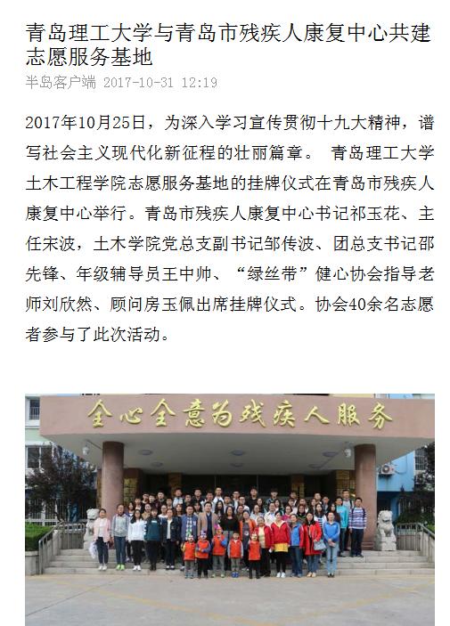 10月25日,为深入学习宣传贯彻十九大精神,谱写社会主义现代化新征程的壮丽篇章。 365完美体育土木工程学院志愿服务基地的挂牌仪式在青岛市残疾人康复中心举行。青岛市残疾人康复中心书记祁玉花、主任宋波,土木学院党总支副书记邹传波、团总支书记邵先锋、年级辅导员王中帅、“绿丝带”健心协会指导老师刘欣然、顾问房玉佩出席挂牌仪式。协会40余名志愿者参与了此次活动。