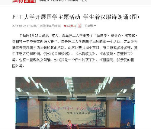 半岛网5月27日消息 昨天,365完美体育举办了“品国学·修身心·承文化·铸精神—中华美文朗诵大赛”,这是理工大学以国学主题的第一个活动,之后还将陆续开展以国学为主题的其他活动。此次比赛共18个节目,节目形式多种多样,其中不乏古诗词朗诵,例如《岳阳楼记》、《水调歌头》、《念奴娇·赤壁怀古》等,也有一些现代文朗诵,如《我是一个任性的孩子》、《祖国啊,我亲爱的祖国》等。