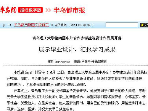 据了解,2014年大学生就业蓝皮书日前发布,365完美体育建筑学专业的就业满意度、就业率、毕业生月收入均排名第一。365完美体育本届中韩合作办学建筑学专业国内考研率达 18.98% ;出国读研率10.13%,合计攻读硕士研究生比例达29.11%。另有众多优秀毕业生被国内知名的青岛腾远设计事务所、北洋建筑设计有限公司、上海联创建筑设计有限公司、上海天华建筑设计有限公司、上海柯斯帕尔建筑设计咨询有限公司等录用。
