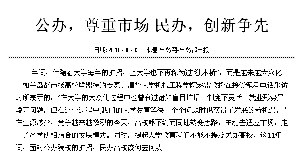11年间,伴随着大学每年的扩招,上大学也不再称为过“独木桥”,而是越来越大众化。正如半岛都市报高校联盟特约专家、清华大学机械工程学院赵雷教授在接受笔者电话采访时所表示的:“在大学的大众化过程中也曾有过诸如盲目扩招、制度不灵活、就业形势严峻等问题,但在这个过程中,我们的大学教育解决一个个问题时也获得了发展的新机遇。”在生源减少,竞争越来越激烈的今天,高校都不约而同地转变思路,主动去适应市场,走上了产学研相结合的发展模式。同时,提起大学教育我们不能不提及民办高校,这11年间,面对公办院校的扩招,民办高校该何去何从?