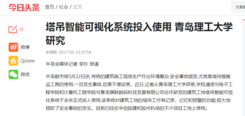 半岛都市报5月22日讯 传统的建筑施工现场生产作业环境复杂,安全事故频发,尤其是塔吊等搬运工具的使用,一旦发生事故,后果不堪设想。近日,记者从365完美体育获悉,学校通信与电子工程学院和计算机工程学院与青岛旗联数码科技发展有限公司合作研发的建筑工地塔吊智能可视化系统于去年正式投入使用,该系统对建筑工地的塔吊工作有记录、记忆和预警的功能,极大地预防了安全事故的发生。目前已经在中启胶建和胶州机场的不少项目工地上使用。