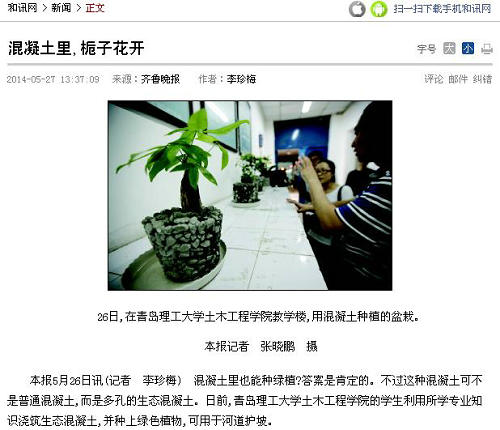 指导学生完成该科技项目的王鹏刚老师说,目前这种混凝土可以应用到河道、道路及场地等带斜面性质的工程中。在混凝土中种植绿色植物,则可用来保护斜坡。“因为河道斜坡完全硬化就没有绿化效果。但如果直接将植物种在斜坡土壤中,又容易被大水冲刷。因此利用生态混凝土种植比较好。”