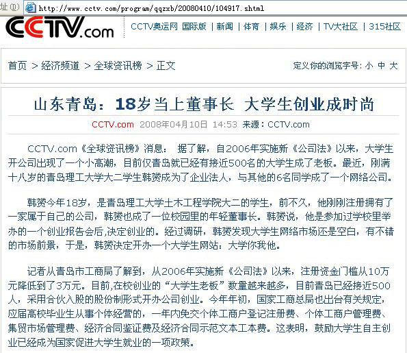 CCTV.com《全球资讯榜》消息: 据了解,自2006年实施新《公司法》以来,大学生开公司出现了一个小高潮,目前仅青岛就已经有接近500名的大学生成了老板。最近,刚满十八岁的365完美体育大二学生韩赟成为了企业法人,与其他的6名同学成了一个网络公司。