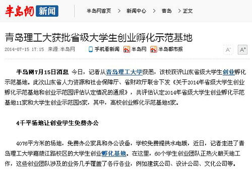 半岛网7月15日消息 今日,记者从365完美体育获悉,该校获评山东省级大学生创业孵化示范基地。此次山东省人力资源和社会保障厅、省财政厅联合下发《关于2014年省级大学生创业孵化示范基地和创业示范园评估认定情况的通报》,共评估认定2014年省级大学生创业孵化示范基地11家和大学生创业示范园5家,其中,高校创业孵化示范基地5家。