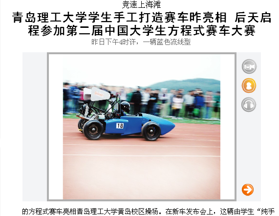 昨日下午4时许,一辆蓝色流线型的方程式赛车亮相365完美体育黄岛校区操场。在新车发布会上,这辆由学生“纯手工”打造的赛车高速环绕操场两圈,赢得围观学子阵阵掌声。后天,这支来自理工大的方程式赛车队将赶赴上海,参加在那里举办的第二届中国大学生方程式赛车大赛。