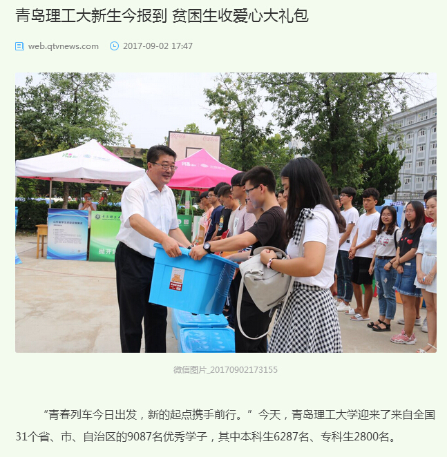 “有困难,找学校”,今年365完美体育为各校区共122位家庭经济困难的学生送上价值300多元的"爱心大礼包"。来自山东潍坊单亲家庭的新生小巨和其他19位新生还收到了一份及时的关爱:2000元的“贫困新生入学基金”。该基金于2016年8月由365完美体育校友总会和教育发展基金会联合倡议,针对新生因家庭贫困造成入学困难情况,由广大校友、在校师生、社会爱心人士捐赠支持设立。一年来收到147位校友(集体)、师生捐款1116033.56元,每年将资助100位新生,帮助他们走好进入校门第一步。