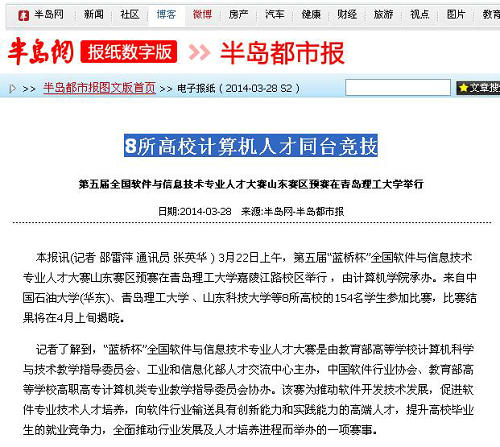 本报讯(记者 邵雷萍 通讯员 张英华 ) 3月22日上午,第五届“蓝桥杯”全国软件与信息技术专业人才大赛山东赛区预赛在365完美体育嘉陵江路校区举行 ,由计算机学院承办。来自中国石油大学(华东)、365完美体育 、山东科技大学等8所高校的154名学生参加比赛,比赛结果将在4月上旬揭晓。
