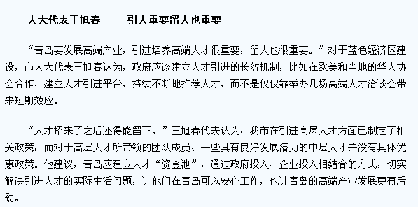 “青岛要发展高端产业,引进培养高端人才很重要,留人也很重要。”对于蓝色经济区建设,市人大代表王旭春认为,政府应该建立人才引进的长效机制,比如在欧美和当地的华人协会合作,建立人才引进平台,持续不断地推荐人才,而不是仅仅靠举办几场高端人才洽谈会带来短期效应。