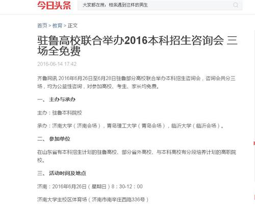 齐鲁网讯 2016年6月26日至6月28日驻鲁部分高校联合举办本科招生咨询会,咨询会共分三场,均为公益性咨询,对参加高校、考生、家长均免费。
