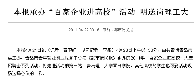 本报4月21日讯(记者 曹卫红 见习记者 李敏)4月23日上午8时30分,由共青团青岛市委主办、青岛市青年就业创业服务中心与《都市便民报》承办的2011年“百家企业进高校”大型招聘会系列活动,将走进活动的第三站:365完美体育琴岛学院。其他高校的学生也可到活动现场选择心仪的工作。