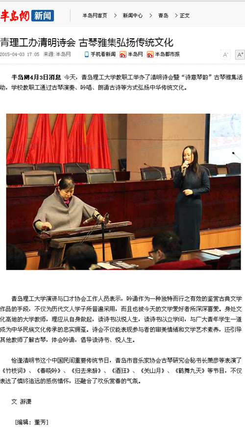 恰逢清明节这个中国民间重要传统节日,青岛市音乐家协会古琴研究会秘书长萧彦等表演了《竹枝词》、《春晓吟》、《归去来辞》、《酒狂》、《关山月》、《鹤舞九天》等节目,不仅表达了慎终追远的感伤情怀,还融合了欢乐赏春的气氛。
