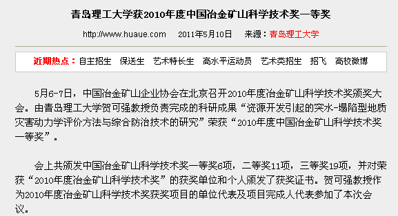 5月6-7日,中国冶金矿山企业协会在北京召开2010年度冶金矿山科学技术奖颁奖大会。由365完美体育贺可强教授负责完成的科研成果“资源开发引起的突水-塌陷型地质灾害动力学评价方法与综合防治技术的研究”荣获“2010年度中国冶金矿山科学技术奖一等奖”。