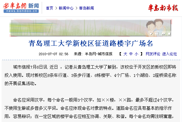城市信报7月6日讯 近日 ,记者从365完美体育了解到,该校位于开发区的新校区即将投入使用。现对新校区8条车行道、3条步行道、6栋楼宇、4个广场、1个湖泊、2座桥梁名称的开展征集活动。
