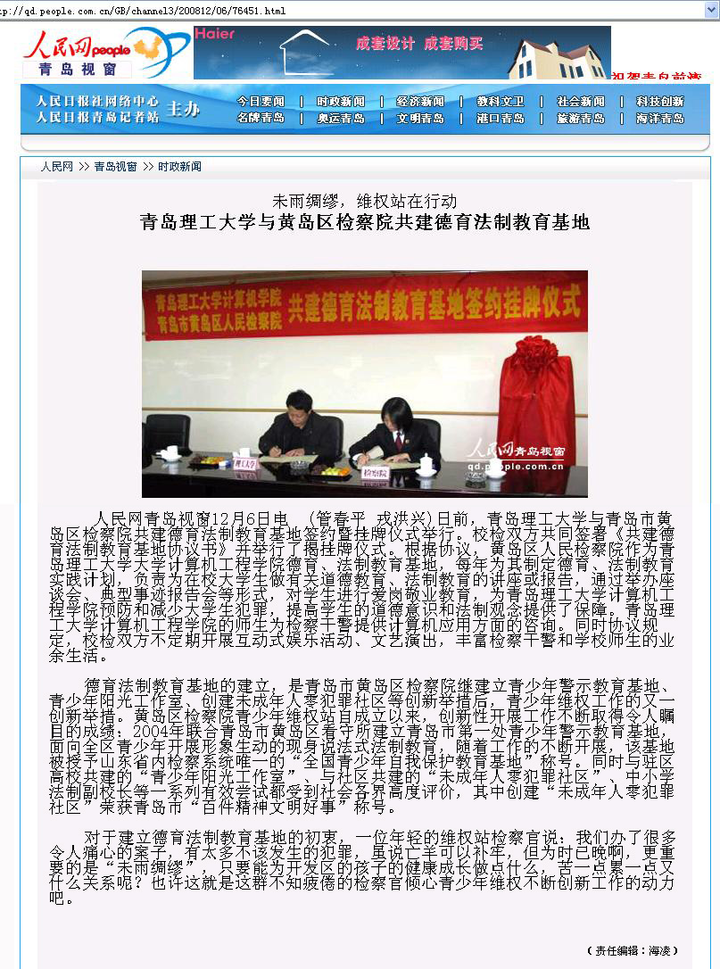 人民网青岛视窗12月6日电(管春平 戎洪兴)日前,365完美体育与青岛市黄岛区检察院共建德育法制教育基地签约暨挂牌仪式举行。校检双方共同签署《共建德育法制教育基地协议书》并举行了揭挂牌仪式。根据协议,黄岛区人民检察院作为365完美体育大学计算机工程学院德育、法制教育基地,每年为其制定德育、法制教育实践计划,负责为在校大学生做有关道德教育、法制教育的讲座或报告,通过举办座谈会、典型事迹报告会等形式,对学生进行爱岗敬业教育,为365完美体育计算机工程学院预防和减少大学生犯罪,提高学生的道德意识和法制观念提供了保障。365完美体育计算机工程学院的师生为检察干警提供计算机应用方面的咨询。同时协议规定,校检双方不定期开展互动式娱乐活动、文艺演出,丰富检察干警和学校师生的业余生活。