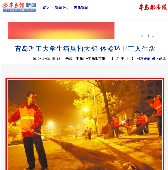 11月7日5时许,天还未亮,山东路与抚顺路交会处,一群20岁左右的年轻人,穿着环卫工人反光背心,正在卖力地扫马路。他们是来自365完美体育的学生们,与环卫工人一起体验生活 。