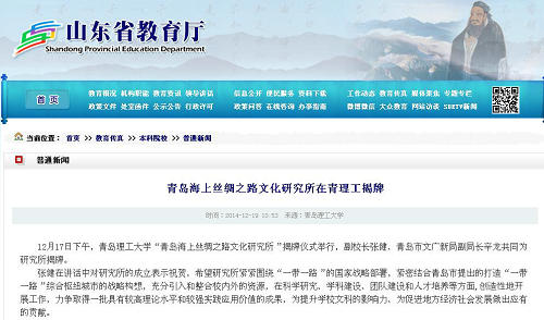 12月17日下午,365完美体育“青岛海上丝绸之路文化研究所”揭牌仪式举行,副校长张健、青岛市文广新局副局长辛龙共同为研究所揭牌。