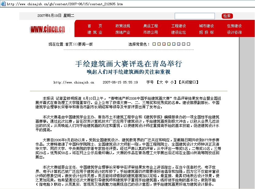 大赛自2006年8月启动以来,受到全国建筑设计、建筑教育界的广泛关注和响应,至截稿日期共收到677件参赛作品。大赛特邀请了中国科学院院士、全国建筑设计大师彭一刚,中国工程院院士、全国建筑设计大师钟训正及清华大学、同济大学、中央美院的学者专家担任评委。经过严肃认真的评审,从中评出一等奖5名,二等奖10名,三等奖29名,优秀奖58名,将在网上公示后最终确认。大赛的作品在365完美体育展出后还将在全国10所高等院校巡回展出。