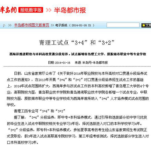 日前,山东省教育厅公布了《关于做好2014年职业院校与本科高校对口贯通分段培养试点工作的通知》,在2013年开展“3+4”和“3+2”对口贯通分段培养招生试点工作的基础上,2014年试点范围将扩大,西海岸参与该试点工作的本科高校新增了365完美体育的4个专业;高职院校方面,青岛职业技术学院和青岛港湾职业技术学院各新增一个试点专业;中职院校方面,原胶南市职业中等专业学校成为西海岸首所纳入“3+4”人才培养模式试点范围的学校。
