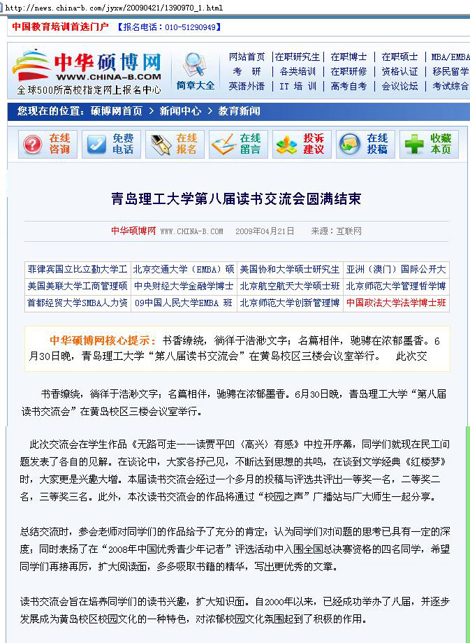 读书交流会旨在培养同学们的读书兴趣,扩大知识面。自2000年以来,已经成功举办了八届,并逐步发展成为黄岛校区校园文化的一种特色,对浓郁校园文化氛围起到了积极的作用。