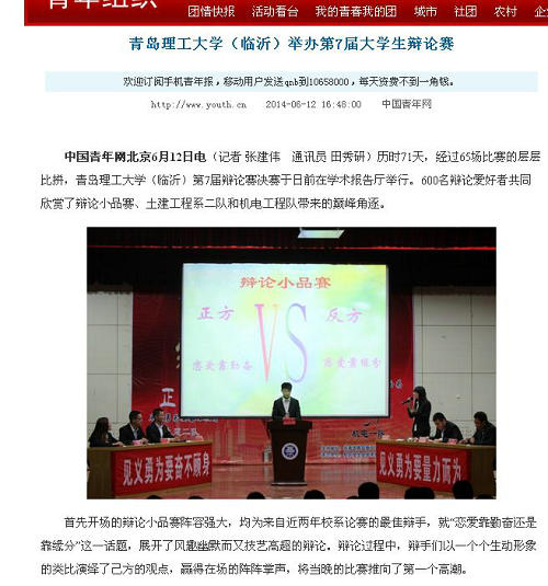 中国青年网北京6月12日电(记者 张建伟 通讯员 田秀研)历时71天,经过65场比赛的层层比拼,365完美体育(临沂)第7届辩论赛决赛于日前在学术报告厅举行。600名辩论爱好者共同欣赏了辩论小品赛、土建工程系二队和机电工程队带来的巅峰角逐。