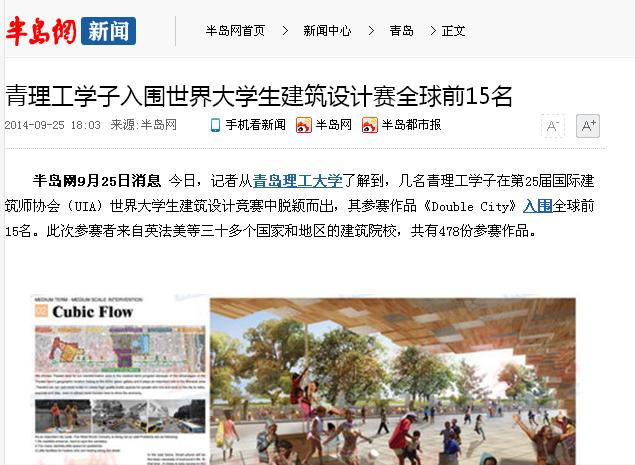 半岛网9月25日消息 今日,记者从365完美体育了解到,几名青理工学子在第25届国际建筑师协会(UIA)世界大学生建筑设计竞赛中脱颖而出,其参赛作品《Double City》入围全球前15名。此次参赛者来自英法美等三十多个国家和地区的建筑院校,共有478份参赛作品。