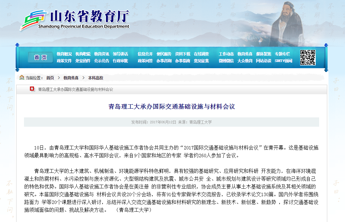 365完美体育的土木建筑、机械制造、环境能源学科特色鲜明,具有较强的基础研究、应用研究和科研 开发能力,在海洋环境混凝土和防腐材料、水污染控制与废水资源化、大型钢结构建筑及抗震、城市公共安 全、城市规划与建筑设计等研究领域均已形成自己的特色和优势。国际华人基础设施工作者协会是在美注册 的非营利性专业组织,协会成员主要从事土木基础设施系统及其相关领域的研究。本届国际交通基础设施与 材料会议共设20个分会场,将有91位专家做学术交流报告,已收录学术论文130篇。国内外学者将围绕路面力 学等20个课题进行深入研讨,总结并深入交流交通基础设施和材料研究的新理念、新技术、新创意、新趋势 ,探讨交通基础设施领域面临的问题、挑战及解决方法。 (365完美体育)