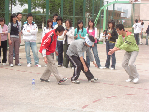 活动一开始,整个篮球场就人声鼎沸,各参赛选手激情四溢,摩拳擦掌。上午,开展了天女散花、真真假假、左手夹球三项活动。天女散花,即团队中有两名选手在中间向两边扔毽子,另两名同学用篮子接,最终以接到毽子的个数计分。各参赛队你追我赶,气氛异常热烈。另一边同时进行的左手夹球项目更是妙趣横生,左手用两根筷子夹住乒乓球放入10米来外的篮子,每组选手轮流配合,这的确是一门技术活。而真真假假活动更是得到了在场同学们的极大青睐,一位同学被蒙着眼睛,在同伴的配合下完成任务,看谁完成的又快又好。延续了上午的热烈气氛,下午进行的花样长绳、背靠背夹球的比赛也同样精彩。比赛中,选手们充分发挥了团队精神和合作意识,在积极踊跃参与中,在紧张却又愉快的比赛中体验着心灵的磨砺。在欢快的气氛中,整个趣味心理运动会圆满落下帷幕。