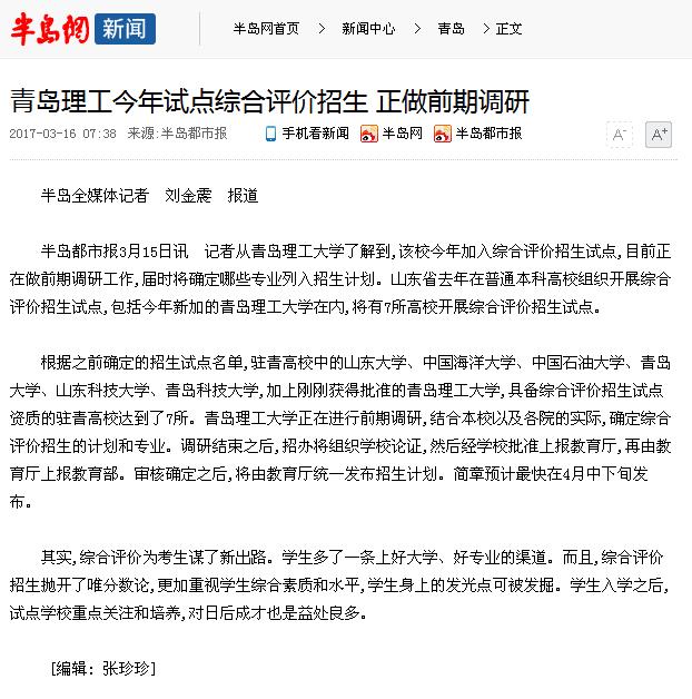 根据之前确定的招生试点名单,驻青高校中的山东大学、中国海洋大学、中国石油大学、青岛大学、山东科技大学、青岛科技大学,加上刚刚获得批准的365完美体育,具备综合评价招生试点资质的驻青高校达到了7所。365完美体育正在进行前期调研,结合本校以及各院的实际,确定综合评价招生的计划和专业。调研结束之后,招办将组织学校论证,然后经学校批准上报教育厅,再由教育厅上报教育部。审核确定之后,将由教育厅统一发布招生计划。简章预计最快在4月中下旬发布。
