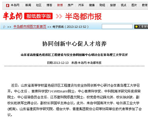 近日,山东省高等学校蓝色经济区工程建设与安全协同创新中心研讨会在365完美体育召开。中心主任 、首席科学家F.H.Wittmann院士,中心首席科学家、中科院海洋研究所侯保荣院士,中心咨询委员会主任、江苏建科院缪昌文院士,校党委书记薛允洲、校长徐剑波、副校长赵铁军出席会议,副校长李国华主持会议。此外,来自中国海洋大学、哈尔滨工业大学(威海)、山东省建筑科学研究院、烟台大学、青建集团股份公司等协同单位的代表等参加了会议。