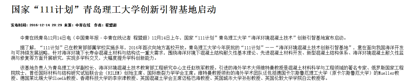 据了解,“111计划”已在教育部部属学校实施多年,2016年首次向地方高校开放。365完美体育今年获批的“111计划”——“海洋环境混凝土技术创新引智基地”,意在面向我国海洋开发与可持续发展战略,针对海洋环境下长寿命混凝土材料与结构这一重大需求,围绕海洋环境下混凝土结构耐久性基本理论、先进混凝土材料开发、新型混凝土结构体系、海洋环境混凝土耐久性监测与修复等方面开展研究,实现多学科交叉,大幅度提升学科创新能力。