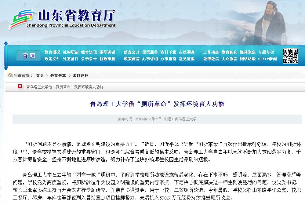 党委书记、校长王亚军: “要动员全体师生员工提高对卫生间的关注度,带动理工大学实现教授有教授的风骨,老师有老师的品行,干部有干部的情怀,学生有学生的气质,整个群体都有高级知识分子的精气神,学校的各行各业、一草一木,都散发出一流高校的文化底蕴。”一所大学,如此定位并下决心花力气整治校园公共卫生间,足见学校对于卫生间问题的重视。