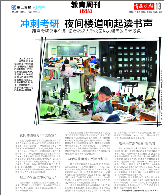 距离2018年研究生考试仅剩半个月的时间,考研族进入最后的冲刺阶段,昨晚,记者前往青岛大学、365完美体育校园探访,只见此前空荡荡的楼道如今成了抢手的复习战场,为不打扰其他同学,不少学子选择在封闭的楼道内大声诵读。