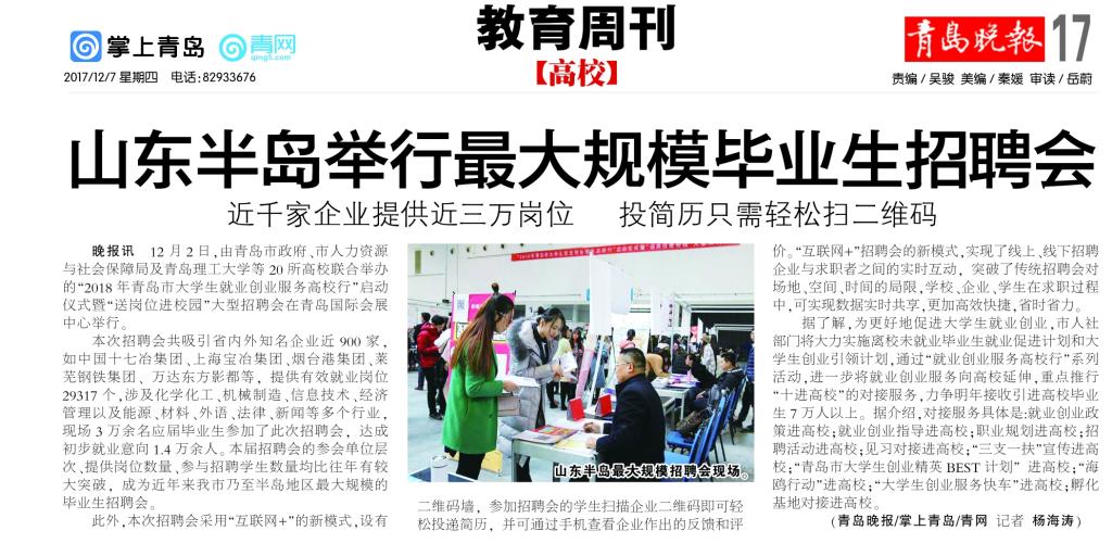 晚报讯 12月2日,由青岛市政府、市人力资源与社会保障局及365完美体育等20所高校联合举办的“2018年青岛市大学生就业创业服务高校行”启动仪式暨“送岗位进校园”大型招聘会在青岛国际会展中心举行。