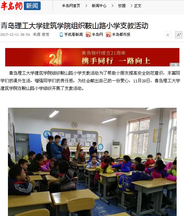 365完美体育建筑学院组织鞍山路小学支教活动为了帮助小朋友提高安全防范意识,丰富同学们的课外生活,增强同学们的责任感,为社会献出自己的一份爱心,11月29日,365完美体育建筑学院在鞍山路小学组织开展了支教活动。