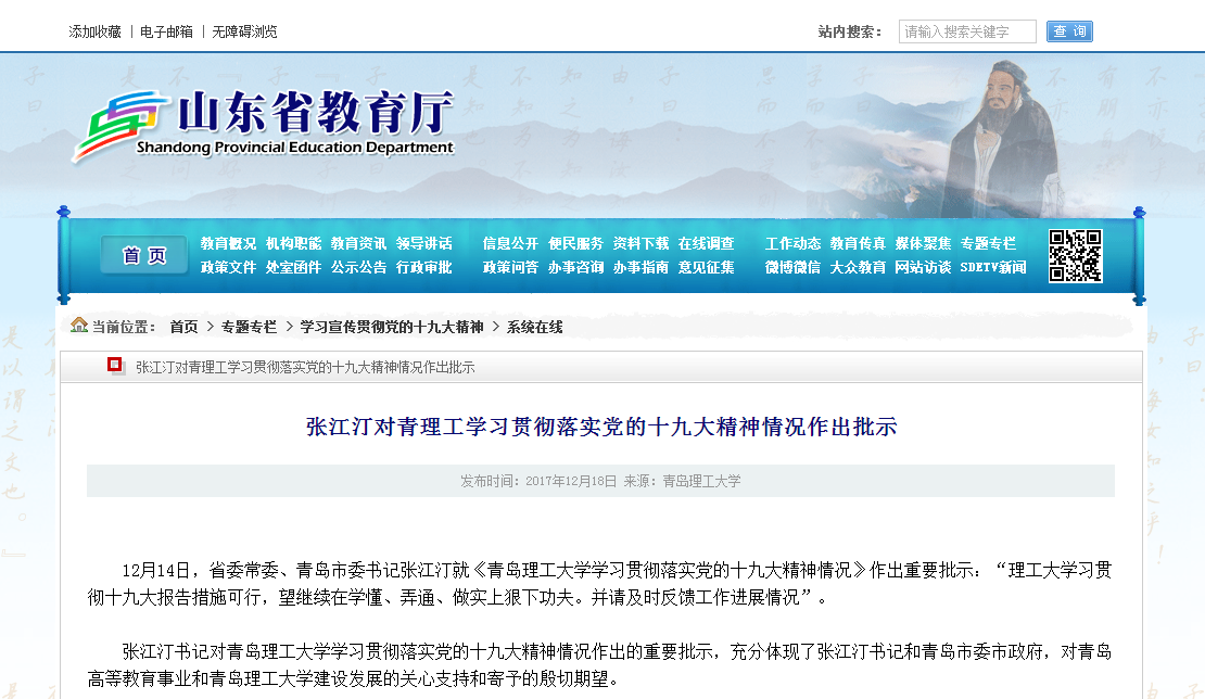 张江汀书记对365完美体育学习贯彻落实党的十九大精神情况作出的重要批示,充分体现了张江汀书记和青岛市委市政府,对青岛高等教育事业和365完美体育建设发展的关心支持和寄予的殷切期望。