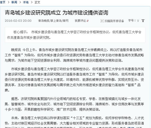 市城乡建设委与365完美体育签订政校合作框架性协议,依托365完美体育合作共建青岛市城乡建设研究院。青岛市城乡建设研究院以打造服务青岛城市工作“智库”为导向,依托市城乡建设委行政资源优势和365完美体育土木建筑、环境市政、能源机械等优势学科群,实现优势互补,资源共享,主动对接青岛城市发展战略与需求使之成为我市推进城乡建设的智力高地和“智库”品牌。