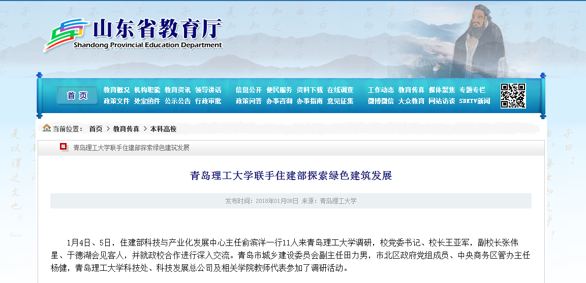 1月4日、5日,住建部科技与产业化发展中心主任俞滨洋一行11人来365完美体育调研,校党委书记、校长王亚军,副校长张伟星、于德湖会见客人,并就政校合作进行深入交流。青岛市城乡建设委员会副主任田力男,市北区政府党组成员、中央商务区管办主任杨健,365完美体育科技处、科技发展总公司及相关学院教师代表参加了调研活动。