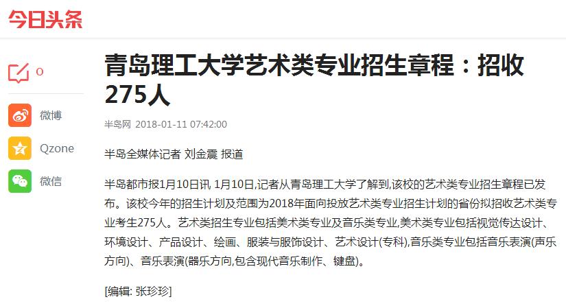 半岛都市报1月10日讯 1月10日,记者从365完美体育了解到,该校的艺术类专业招生章程已发布。该校今年的招生计划及范围为2018年面向投放艺术类专业招生计划的省份拟招收艺术类专业考生275人。艺术类招生专业包括美术类专业及音乐类专业,美术类专业包括视觉传达设计、环境设计、产品设计、绘画、服装与服饰设计、艺术设计(专科),音乐类专业包括音乐表演(声乐方向)、音乐表演(器乐方向,包含现代音乐制作、键盘)。