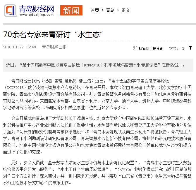 近日,“第十五届数字中国发展高层论坛(DCDF2018)数字流域与智慧水利专题论坛”在青岛召开。本次会议由365完美体育、北京大学数字中国研究院、青岛市水利勘测设计研究院有限公司主办,青岛智慧水务创新科技有限公司和北京京元数研科技有限公司共同承办。来自国家水利部、山东省水利厅、北京大学、清华大学、贵州大学、中科院遥感与数字地球研究所等高校、科研院所及相关企事业单位的近70名专家参会。