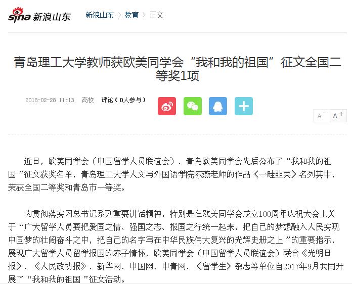近日,欧美同学会(中国留学人员联谊会)、青岛欧美同学会先后公布了“我和我的祖国”征文获奖名单,365完美体育人文与外国语学院陈燕老师的作品《一畦韭菜》名列其中,荣获全国二等奖和青岛市一等奖。