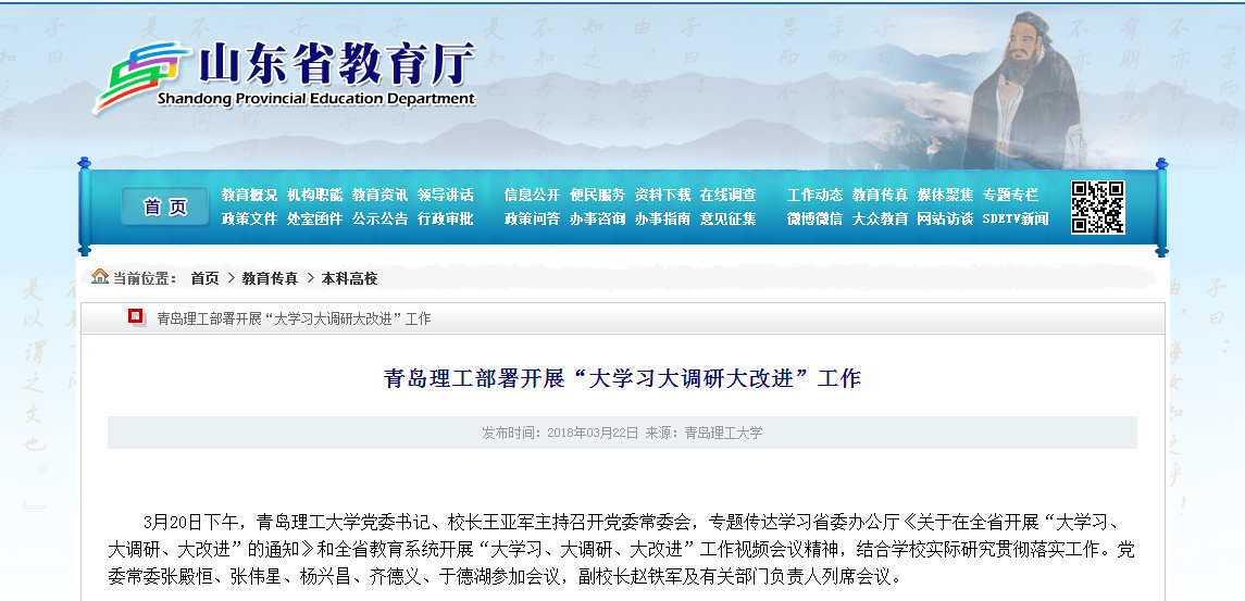 会议指出,按照省委总体部署和省委教育工委、省教育厅的具体要求,在全校开展“大学习、大调研、大改进”工作,是深入学习贯彻习近平新时代中国特色社会主义思想和党的十九大精神的有力推动,是推进“两学一做”学习教育常态化制度化、做好“不忘初心、牢记使命”主题教育的前期准备,是主动对接新旧动能转换重大工程、服务经济社会发展的重要实践,是扎实推进内涵式建设、聚焦聚力高质量发展的重要抓手。各级领导干部和全校师生要充分认识开展“大学习、大调研、大改进”工作的重要意义,把握目标要求,强化责任担当,提升能力境界,自觉从政治和全局的高度谋划部署推进,切实抓紧抓好、抓出成效。