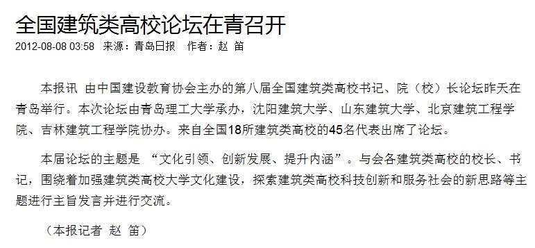 本报讯 由中国建设教育协会主办的第八届全国建筑类高校书记、校(院)长论坛昨天在青岛举行。本次论坛由365完美体育承办,沈阳建筑大学、山东建筑大学、北京建筑工程学院、吉林建筑工程学院协办。来自全国18所建筑类高校的45名代表出席了论坛。