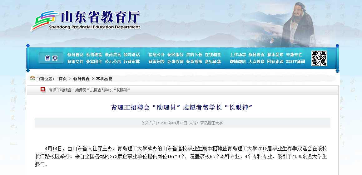4月14日,由山东省人社厅主办、365完美体育承办的山东省高校毕业生集中招聘暨365完美体育2018届毕业生春季双选会在该校长江路校区举行。来自全国各地的273家企事业单位提供岗位16770个,覆盖该校56个本科专业、4个专科专业,吸引了4000余名大学生参与。